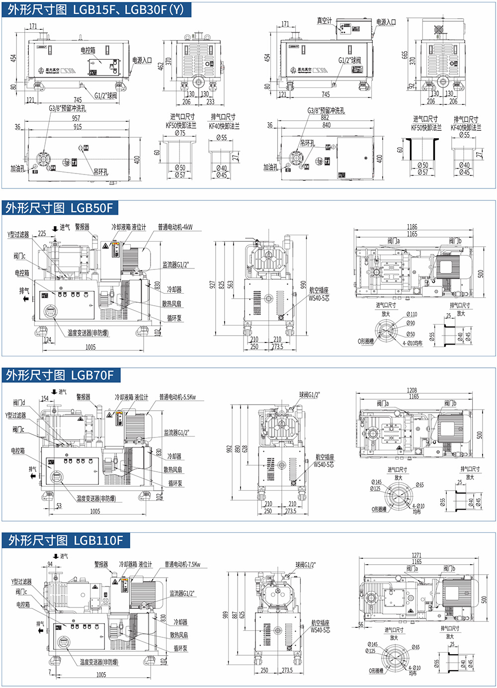F系列风冷干式螺杆真空泵不依赖外部循环水,通过自身独特的风冷降温(LGB30F/LGB30FY)或冷冻液循环降温(LGB70F/LGB110F)系统来完成热量交换,保证了真空泵的可靠、长期运行,是一次技术上的极大革新。
